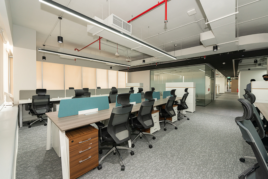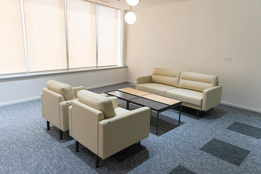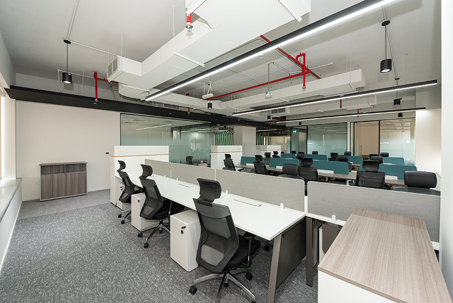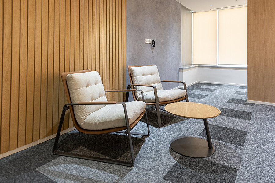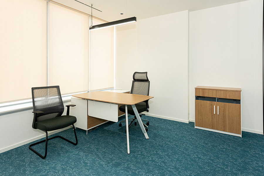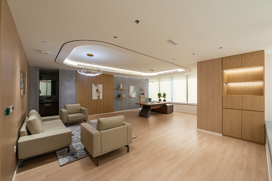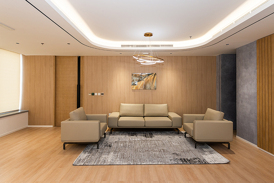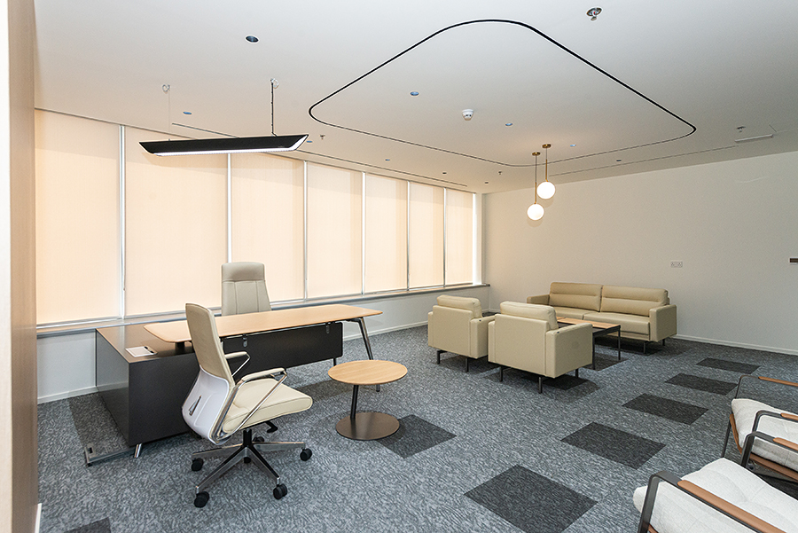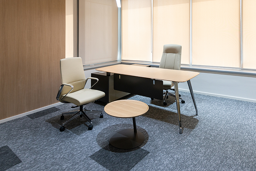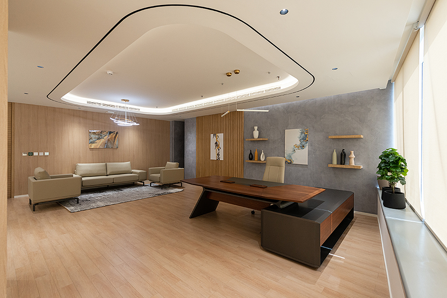 The executive rooms exude luxury with their expansive layout, light wooden flooring, and imposing dark veneer executive desks. Leather chairs and light leather sofas complete the sophisticated look, offering comfort and style to the office’s leadership.
