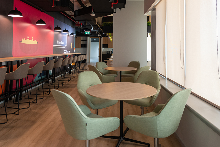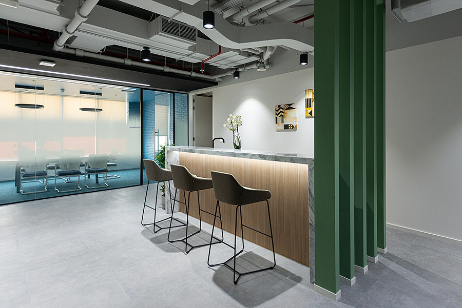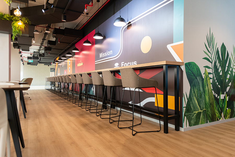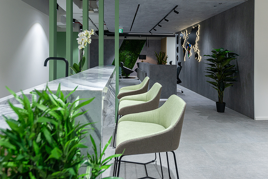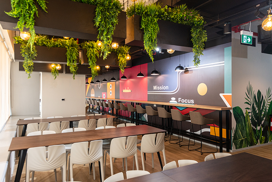 In the pantry and breakout rooms, a strong biophilic element takes center stage. Green plants adorn the ceiling, walls, and floors, creating a natural oasis within the office environment. Bright and colorful wallpaper adds a vibrant touch, transforming these spaces into inviting areas for staff to relax and recharge.