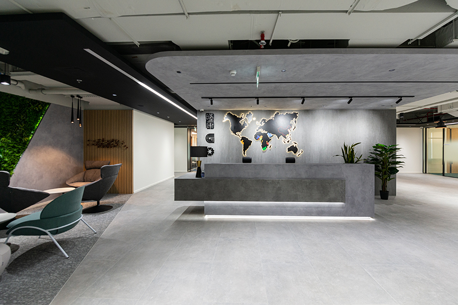 Welcome to another corporate office project, where we had the pleasure of supplying office furniture for a complete modern workplace. The space boasts a stunning dark-themed reception area, featuring a captivating 3D back-lit map projected on one wall behind a large reception desk. A biophilic moss wall on the other side accompanied by colorful, modern lounge seating welcomes visitors with a touch of nature. LED lights throughout the reception area amplify the modern aesthetic, setting the tone for the entire office.